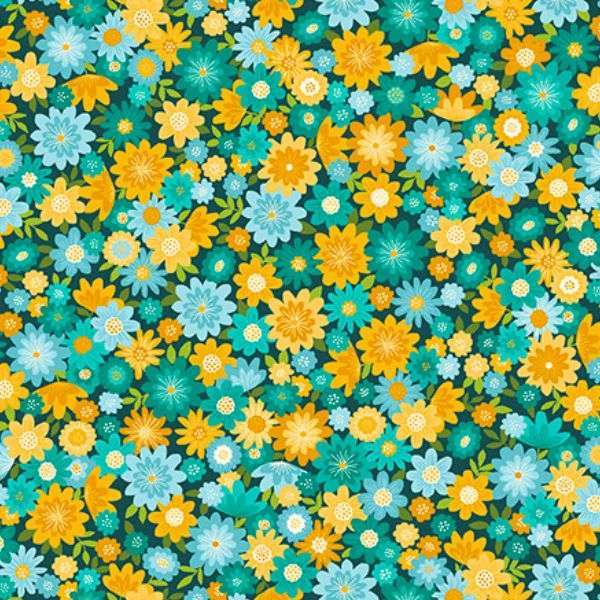 011 T Pretty Posy Teal by Makower features bright florals all over.