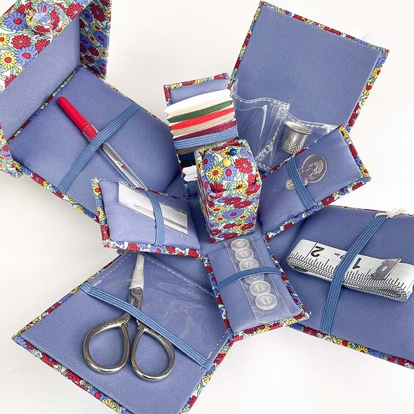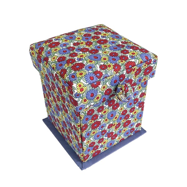 0166HB-VICBOX-B Marguerite Meadow Victorian Style Sewing Box Liberty Fabrics is a splendid way to store your sewing supplies. Slightly lift the lid for the sides to fall open, presenting your notions on display, organized and easy to reach. With needles, pins, a needle threader, thread, buttons, scissors, a tape measure and more, it makes the perfect gift for beginner and advanced sewists alike.