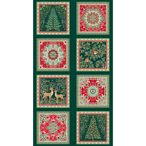 031-1 Panel, Enchanted Christmas by Makower is a 24″ panel features squares of Christmas trees, reindeer, and winter foliage.