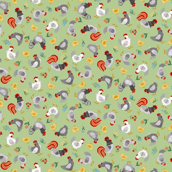 070_G Chickens Green, Fun on the Farm by Makower is a design of chickens, roosters and chicks on a green background.