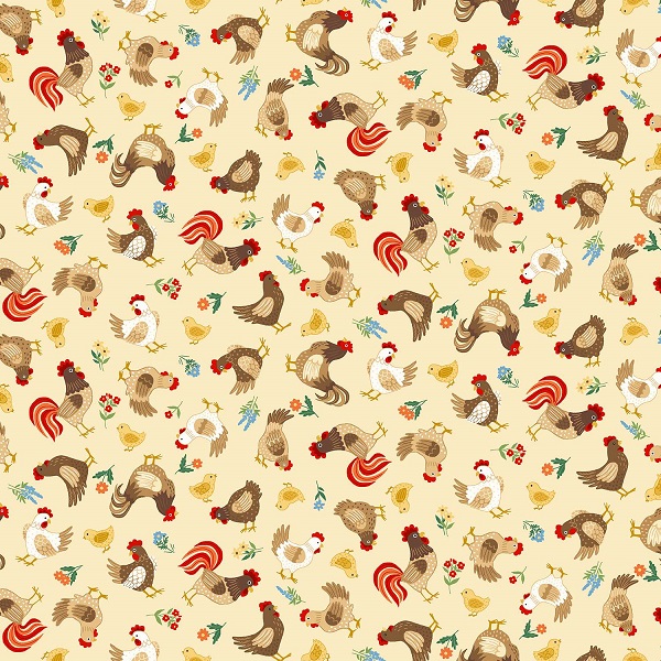 070_Q Chickens Cream, Fun on the Farm by Makower is a design of chickens, roosters and chicks on a cream background.