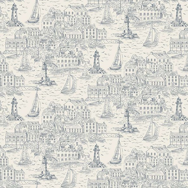 077_Q Harbour View Cream, High Tide by Makower is a design of buildings, lighthouses and boats in black and white.