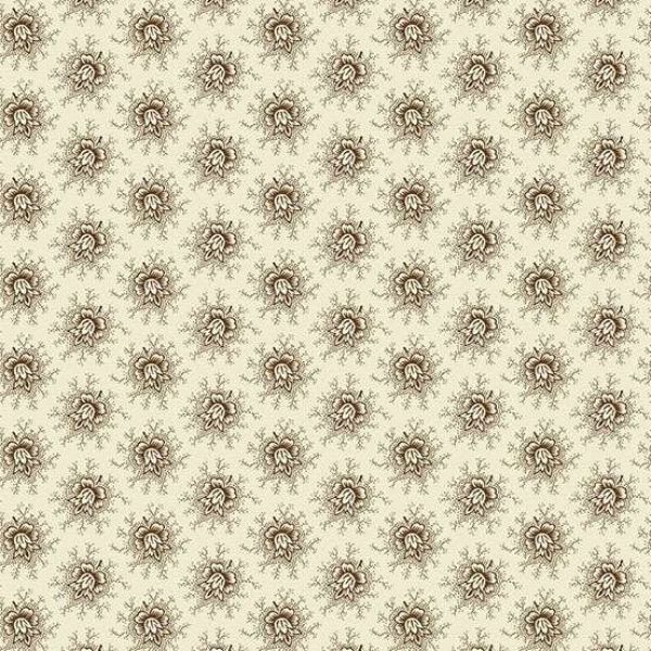 10105-N Rose Chocolate, Hazelmont Farm Shirtings by Max and Louise features a beautiful design of chocolate brown flowers on a cream background.