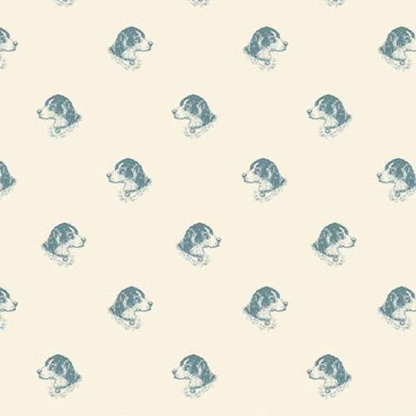 10106-B Roy Lagoon, Hazelmont Farm Shirtings by Max and Louise features a lovely dog sketched in blue on a cream background.