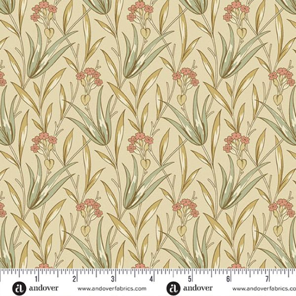 10173-L Cream Milkweed: Autumn Bouquet: Renee Nanneman is featuring a soft cream background, this delicate print displays slender green leaves and clusters of muted coral blossoms. The gentle, nature inspired pattern gives a timeless and graceful look perfect for quilt backgrounds, sashing, or adding a touch of vintage charm to any project.