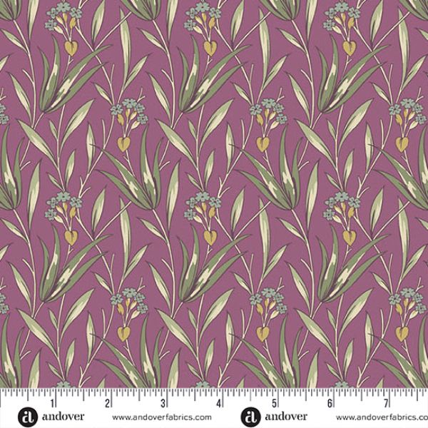 10173-P Purple Milkweed: Autumn Bouquet: Renee Nanneman is featuring a purple background, this delicate print displays slender green leaves and clusters of muted coral blossoms. The gentle, nature inspired pattern gives a timeless and graceful look perfect for quilt backgrounds, sashing, or adding a touch of vintage charm to any project.