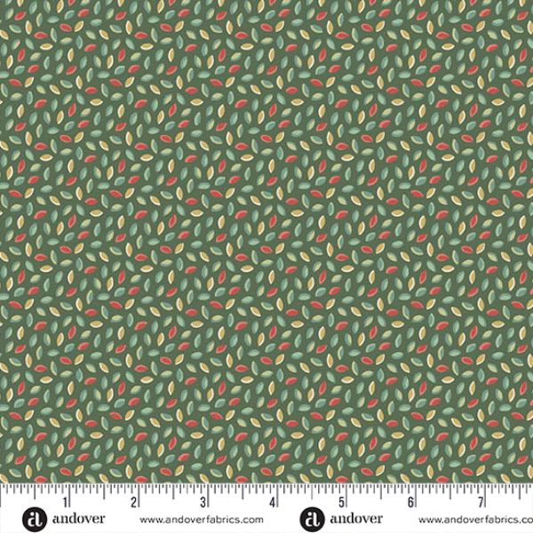 10174-G Green Pumpkin Seeds: Autumn Bouquet: Renee Nanneman is featuring a rich green background sprinkled with tiny leaves in shades of gold, rust, and sage, this charming print adds warmth and texture to any project. Its small scale design makes it ideal for quilt backgrounds, borders, or pairing with larger florals for a classic autumn touch.