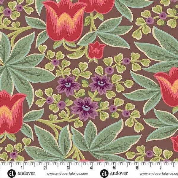 10374N Paradise Teak, Paradise by Renee Nanneman features a beautiful design featuring red tulips and purple flowers on a soft brown background.