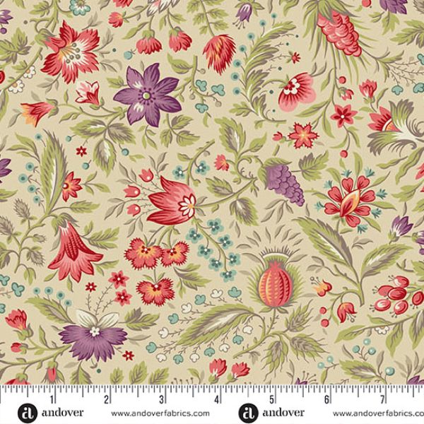 10375L Tropical Bone, Paradise by Renee Nanneman features a beautiful print of tropical flowers with blue, purple and red petals on a pale background.