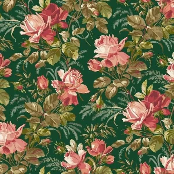 Centerpiece Spruce features beautiful large pink roses on a dark green background.