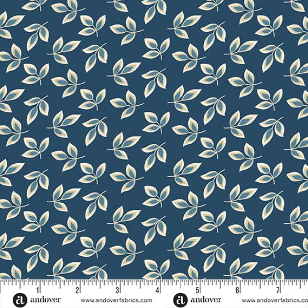10471-B Jewelweed Indigo, Special Delivery by Edyta Sitar is a beautiful print of light blue leaves on a rich indigo background.
