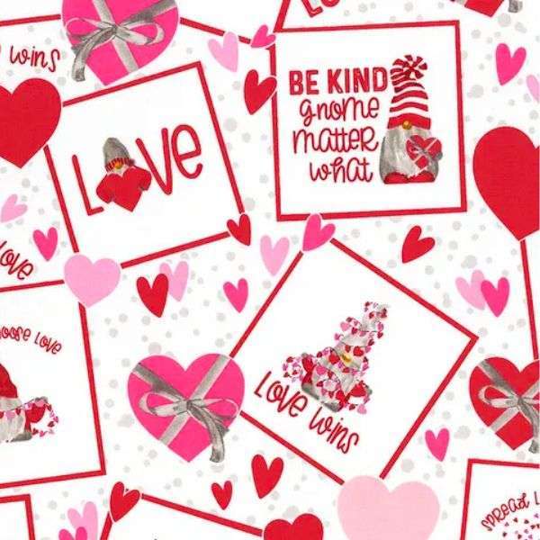11310 White Gnomes in Love by Tara Reed for Riley Blake Designs is a perfect Valentine’s day fabric. This fabric features gnomes surrounded by heart motifs, boxes of chocolates and lettering on a red background. Ideal patchwork and quilting projects. Let a little love into your next project. A very cute fabric full of love.
