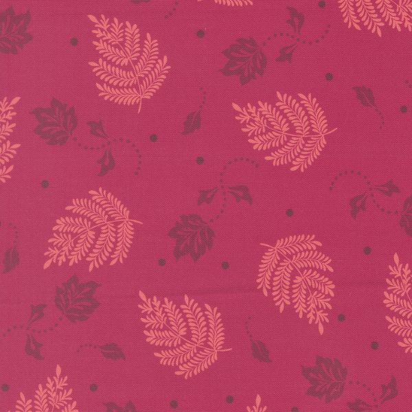 11986 24 Paisley Leaf Pomegranate, Sitara by Crystal Manning is a beautiful print of detailed light leaves and dots on a rich red background.