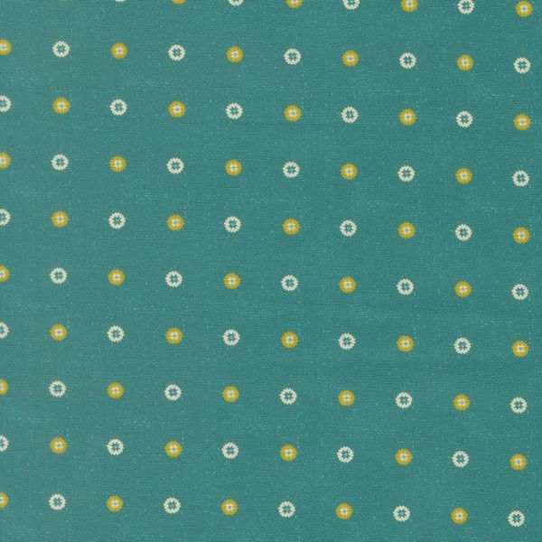11987 15 Floret Dots Lagoon, Sitara by Crystal Manning is a charming print of white and yellow flower-like dots on a dark teal background.