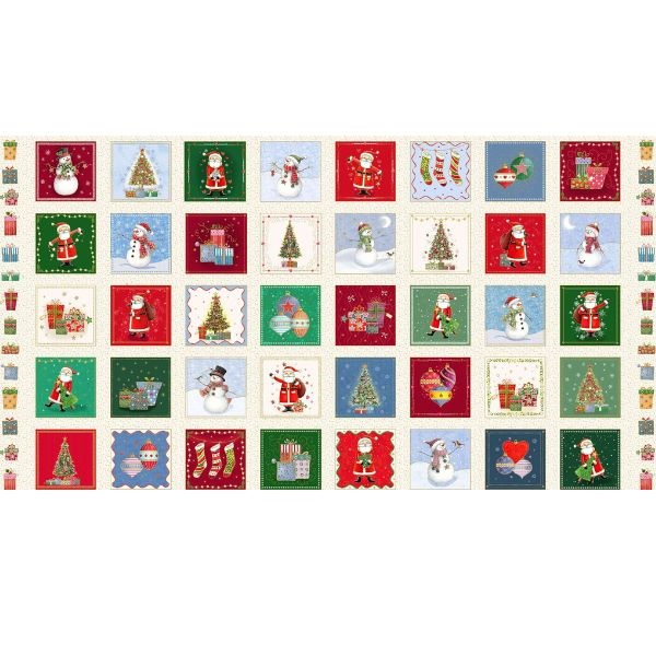 127_1 Squares Panel, Jolly St Nick by Makower . Follow Jolly St Nick on his rounds as he delivers the joy and cheer of the season. This collection is jam packed with festive fun including adorable decorations, snowmen and sparkling stars.