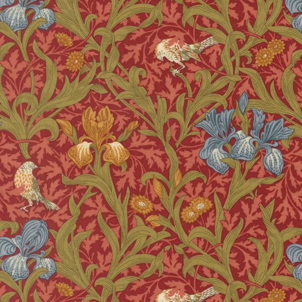 13380 16 Iris Florals Birds Russet, Morris Muse by Barbara Brackman is a beautiful detailed pattern of Iris flowers and birds on a red background.