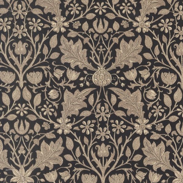 13383 17 Triple Net Florals Ebony, Morris Muse by Barbara Brackman is an detailed pattern of pale flowers on a black background.