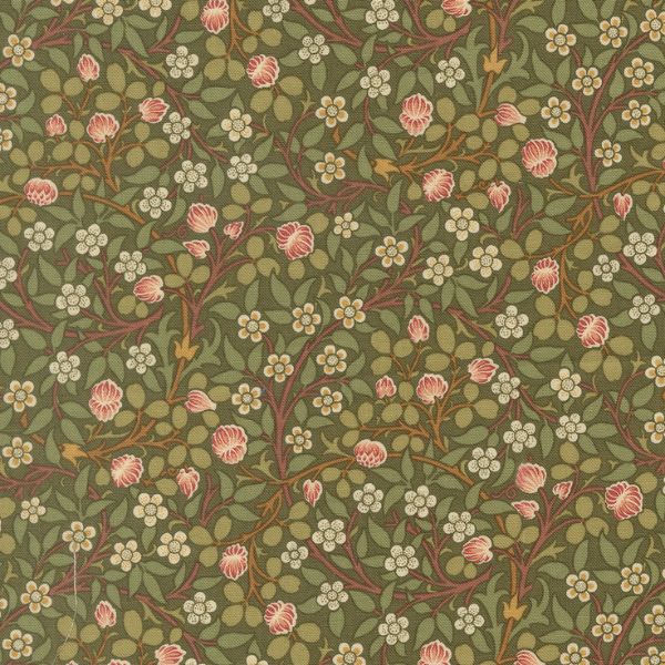 13385 12 Clover Small Floral Sage, Morris Muse by Barbara Brackman features an intricate pattern of pink and white flowers on a dark green background.