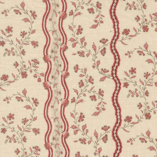 13993 11 Jonquille Stripes Floral Pearl, Fleur de Paris by French General features a pattern of beautiful red flowers on a cream background with curved stripes.