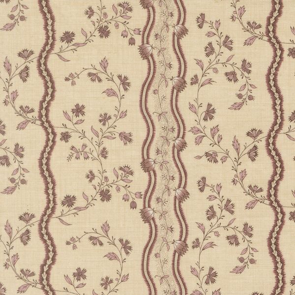 13993 14 Jonquille Stripes Floral Lavender, Fleur de Paris by French General features a pattern of beautiful lavender flowers on a cream background with curved stripes.