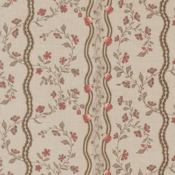 13993 16 Jonquille Stripes Floral Smoke, Fleur de Paris by French General features a pattern of beautiful red flowers on a grey background with curved stripes.