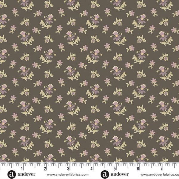 1593-C Charcoal Scatter Garden: Wildflower Cottage: Renee Nanneman featuring a deep charcoal background sets the stage for delicate scattered floral clusters in soft green and mauve tones. This small scale print is perfect for adding depth and contrast to quilts, while maintaining a subtle, vintage charm.