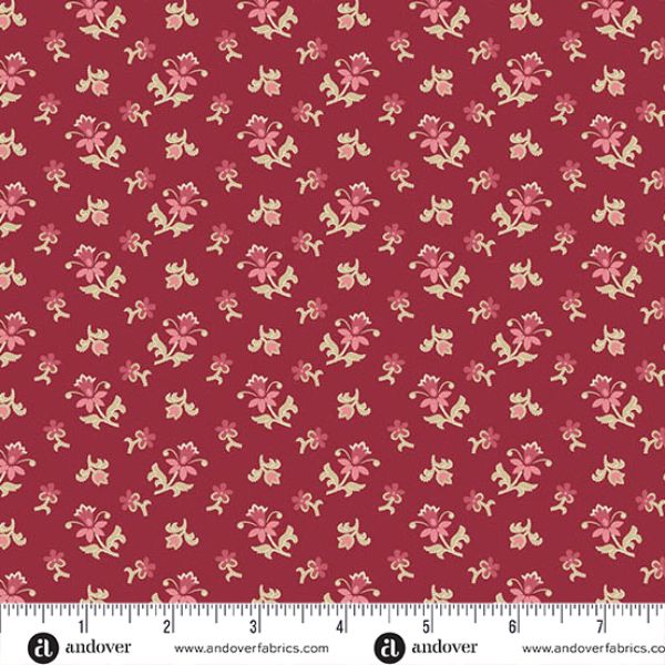 1593-R Crimson Scatter Garden: Wildflower Cottage: Renee Nanneman featuring a crimson red background hosts charming scattered floral clusters in shades of rose, lavender, and cream. The design’s small scale flowers evoke a cozy, cottage feel, making it perfect for quilt backgrounds, sashing, or blending with larger floral prints