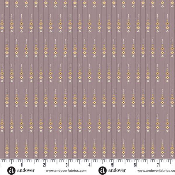 1595-P Thistle Petal Chain: Wildflower Cottage: Renee Nanneman this fabric features a light purple background adorned with delicate vertical chains of tiny diamond and petal motifs in warm gold and cream. The evenly spaced, linear design adds structure while maintaining a soft, vintage feel