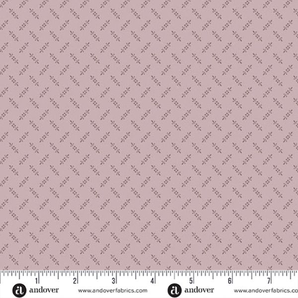 1597-P Lilac Fern Moss: Wildflower Cottage: Renee Nanneman is featuring a beautiful lilac background sprinkled with petite moss fern sprigs arranged in a soft diagonal pattern in a deep purple. The tones give it a timeless, vintage feel perfect as a light blender fabric, background for piecing, or a subtle accent in traditional and cottage inspired quilts.