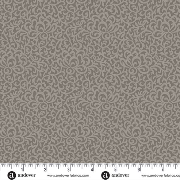 1599-C Pewter Garden Gate: Wildflower Cottage: Renee Nanneman is a sophisticated tonal print featuring a scrolling garden gate motif in soft pewter grey. The intricate, lace like pattern adds subtle elegance, making it a versatile blender for quilts, apparel, and home décor while keeping a timeless cottage charm.
