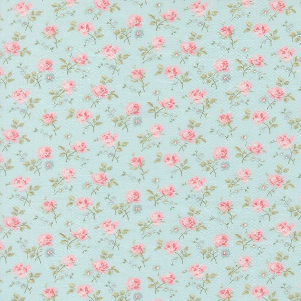 18791 14 Field Floral Small Florals Light Blue, Abide by Brenda Riddle Designs features beautiful delicate pink flowers on a light blue background.