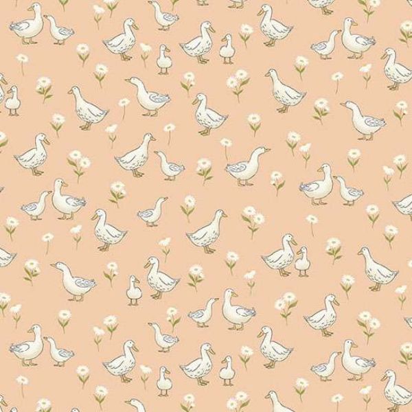190_C Ducks Coral, Little Ones by Makower is a beautiful print of cute ducks and flowers on a soft coral background.