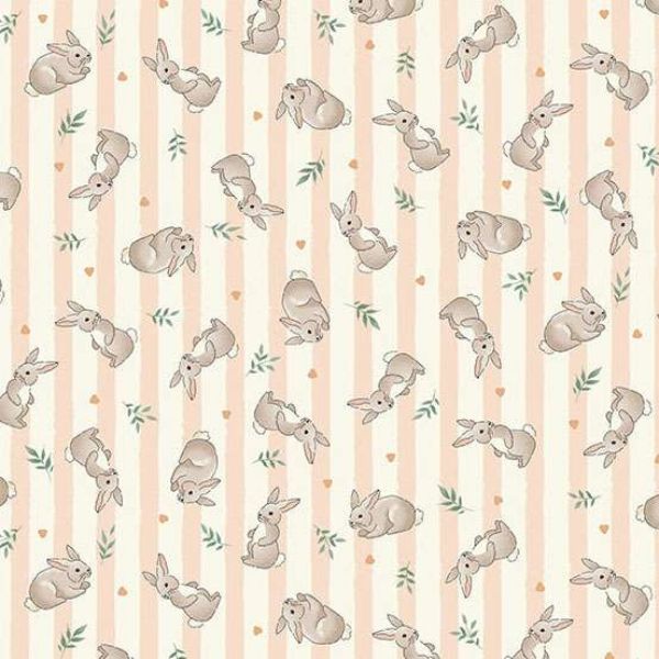 191_C Bunnies Coral, Little Ones by Makower is a beautiful print of bunnies and leaves on a soft coral and white striped background.