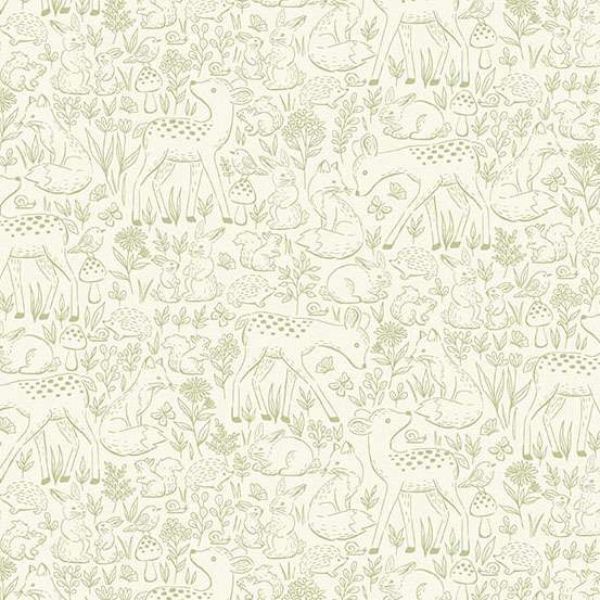 194_G Etched Green, Little Ones by Makower is a gorgeous print of green outlined deer, flowers, branches, mushrooms, foxes and more woodland animals on a cream background.