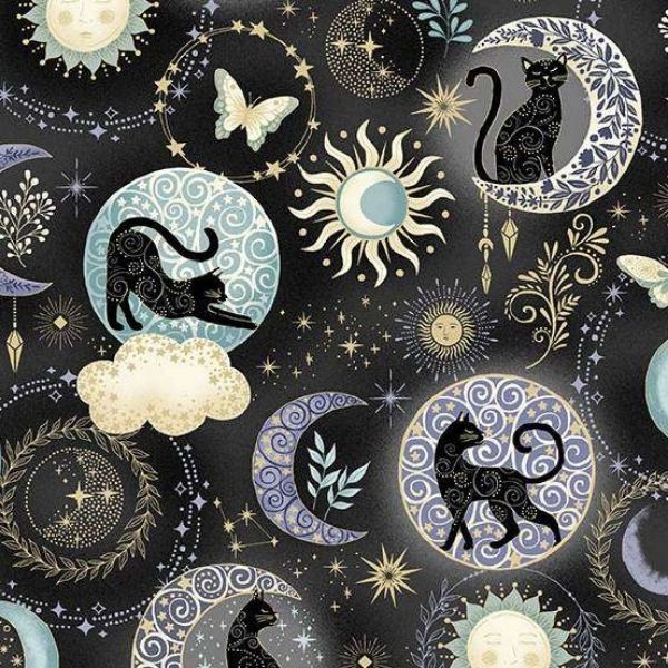 196-X Twilight Black, Charmed by Makower features a beautiful astronomy-inspired print of cats, butterflies, stars, moons and constellations on a black background.
