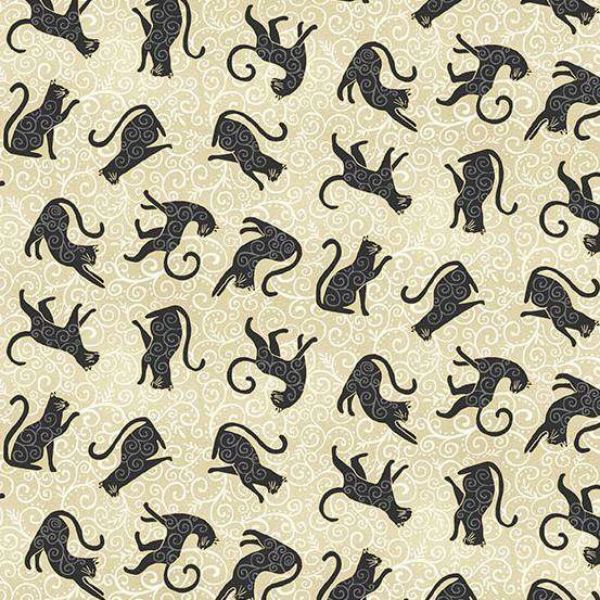 197-Q Whiskers Cream, Charmed by Makower features a beautiful print of black cats on a swirly cream background.