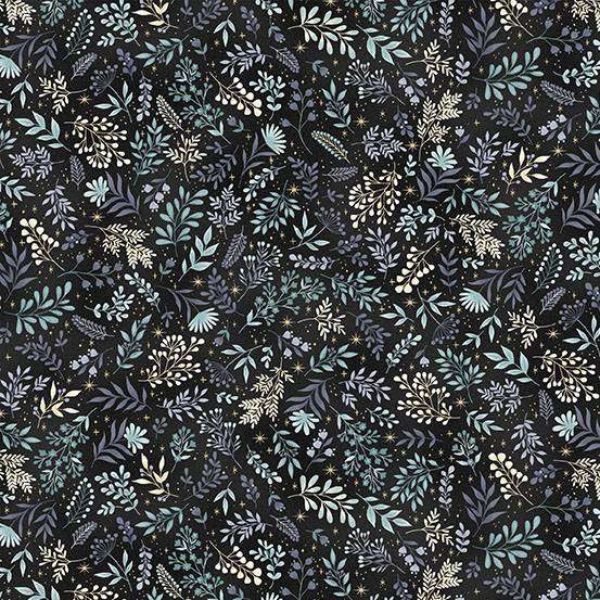 199-X Flora Black, Charmed by Makower features a gorgeous print of blue and white flowers on a black background.