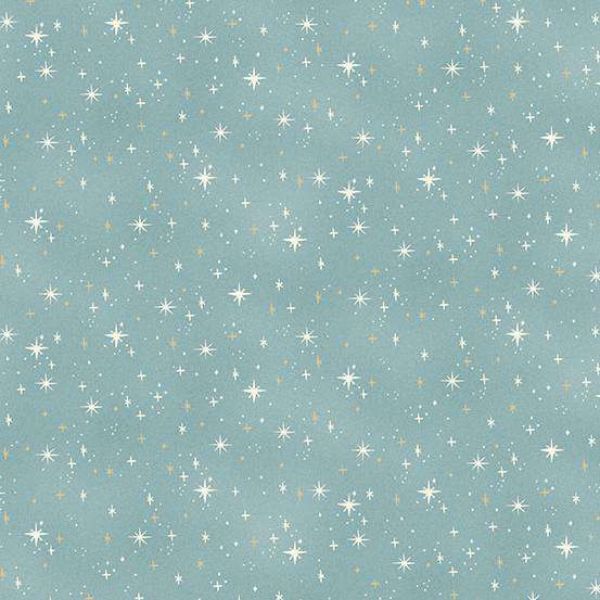 200-T Shimmer Teal, Charmed by Makower features a print of white and gold stars on a teal background.