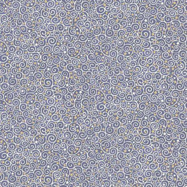201-B Scroll Blue, Charmed by Makower features a gorgeous print of white swirls on a blue background with gold stars.