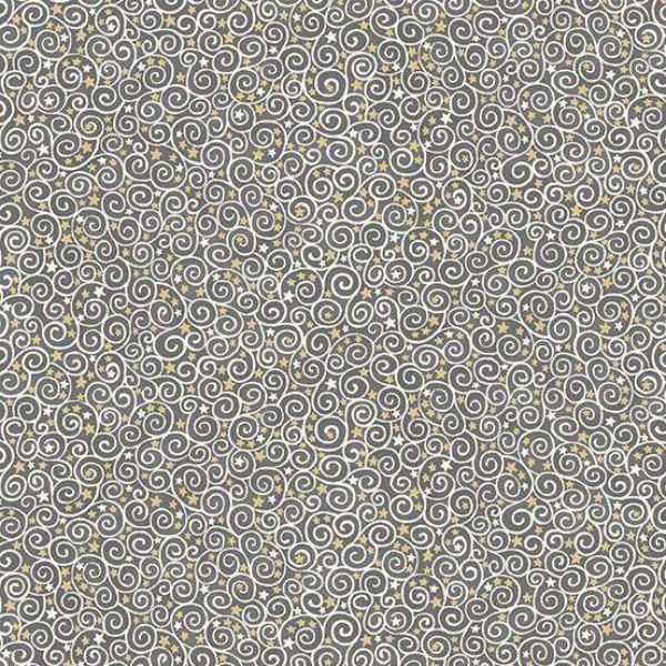 201-S Scroll Grey, Charmed by Makower features a gorgeous print of white swirls on a grey background with gold stars.