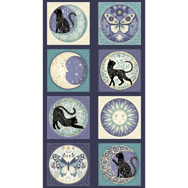 202-1 Panel, Charmed by Makower is a 24 inch panel featuring gorgeous 10″ squares of moons, butterflies, cars and constellations.