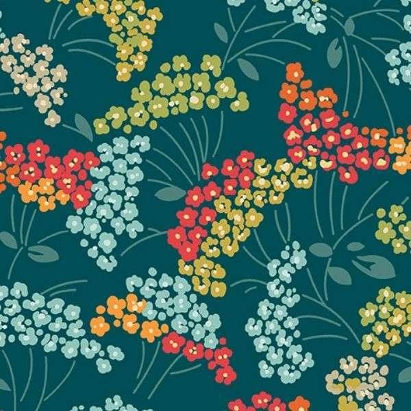 This is a beautiful modern floral collection. Enjoy pretty flowers and ditsy prints in a fresh Spring palette of teals, olive greens, coral pinks and mustards. These fabrics combine beautifully together! Grow a garden in any season with these fabrics.
