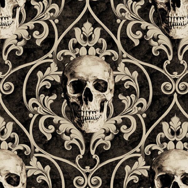 2160-99 Skull Damask Black, Deja Boo by Blank Quilting features skulls on a cream and black damask pattern background.