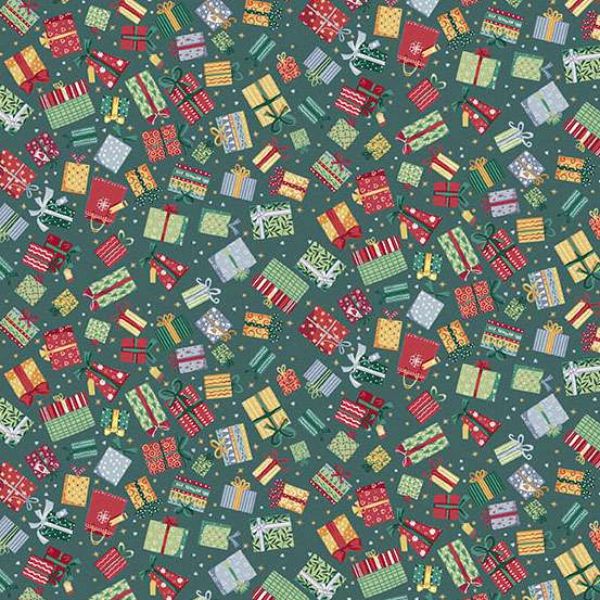 233-G Presents Green, Country Christmas by Makower is a fun print of colourful Christmas presents on a dark green background.