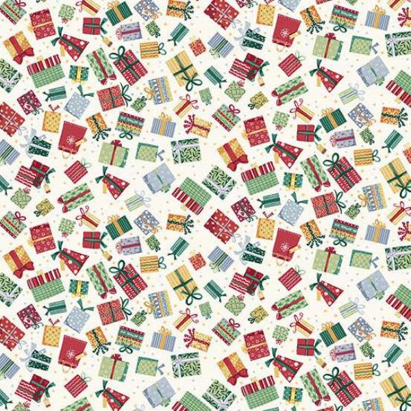233-Q Presents Cream, Country Christmas by Makower is a fun print of colourful Christmas presents on a cream background.