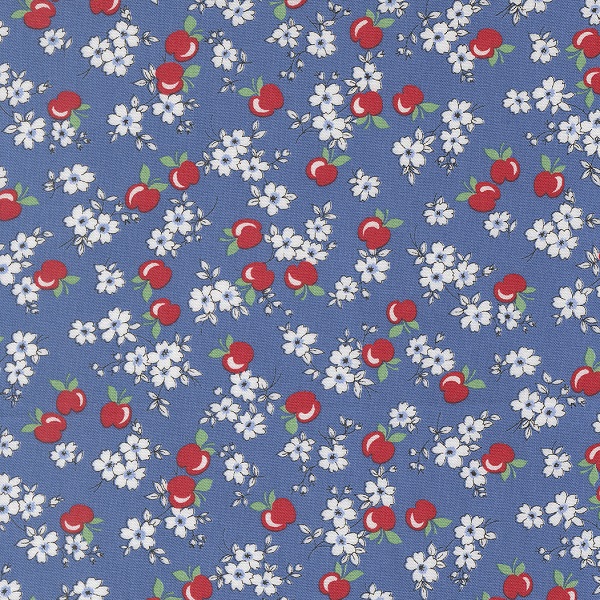 23371 18 Apple Blossom Bluebell, 30’s Playtime by Linzee Kull McCray is a design of apples and blossom flowers on a blue background.