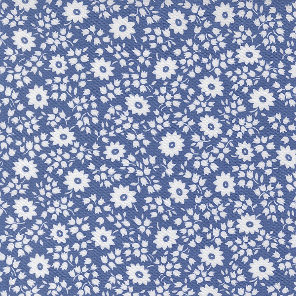 23372 18 Perky Posies Bluebell, 30’s Playtime by Linzee Kull McCray is a design of cream flowers on a blue background.