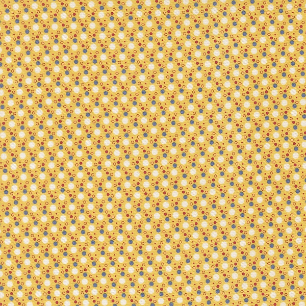 23376 15 Bubbly Dots Sunshine, 30’s Playtime by Linzee Kull McCray is a design of multicoloured dots on a yellow background.