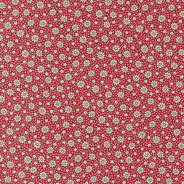 23379 14 Dotty Daisy Scarlet, 30’s Playtime by Linzee Kull McCray is a design of cream daisies on a red background.