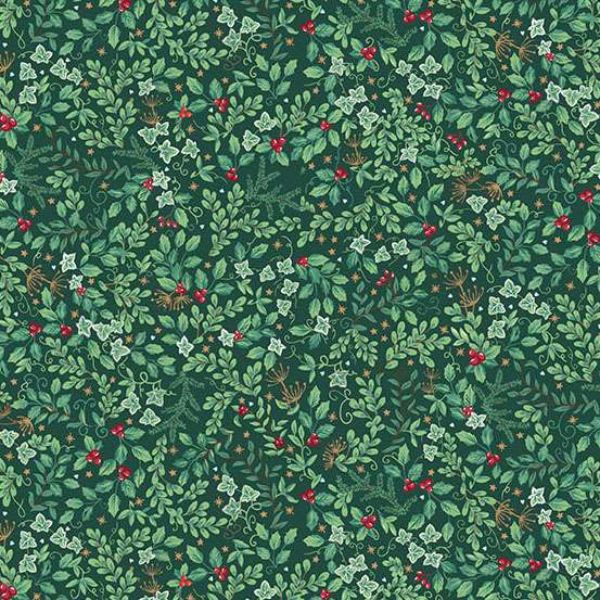234-G Evergreen Green, Country Christmas by Makower is a pattern of leaves, branches, and holly on a dark green background.